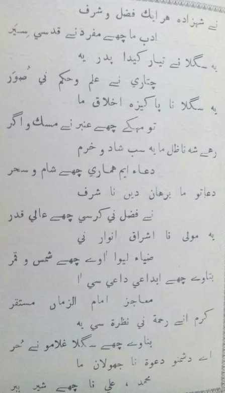 He then goes onto praise Syedna Mohammed BurhanuddinRA and refers to his throne of ‘fazal’ and ‘sharaf’ as ‘aali qadr’ amongst the Duat (11th verse). The immediate meaning is that this chair of fazal and sharaf is of a majestic significance. However, a closer inspection of the verse reveals the double meaning intended for the discerning reader. Mufaddal is a derivative of fazal and ‘aali qadr’ is also the name bestowed upon Syedna Mufaddal Saifuddin TUS by his grandfather.
