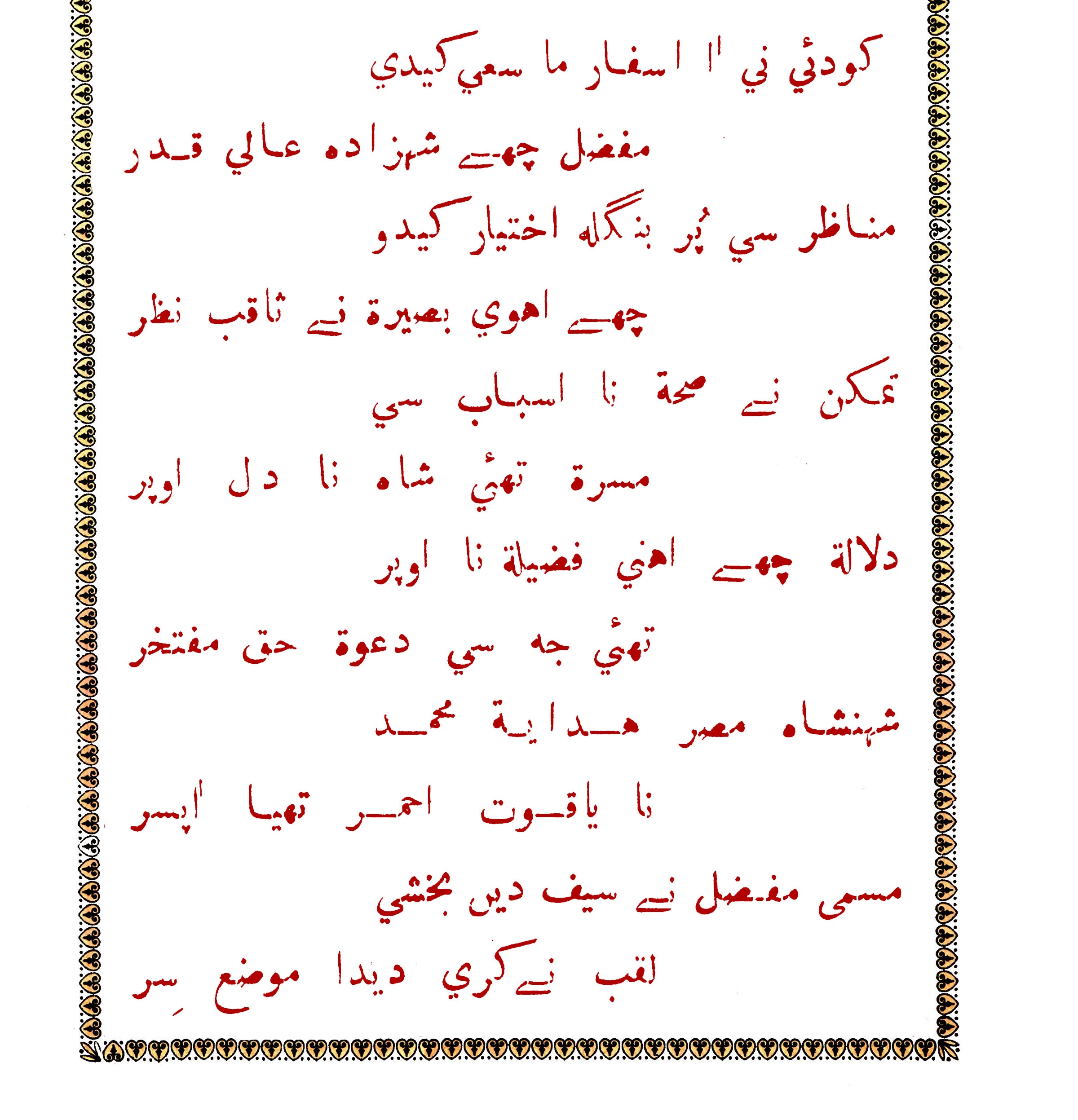 Miyasaheb speaks of the endeavours of Syedna Mufaddal SaifuddinTUS during this trip and refers to his ‘baseerat’ and his discerning vision (2nd verse). His khidmat is evidence of his ‘fazilat’ which is a source of pride for Dawat ul Haq (4th verse). He describes Syedna Mohammed BurhanuddinRA as the king of Misr and its red ruby “yaqut e ahmar” as his son (5th verse). The expression ‘red ruby’ is synonymous with the maqam of Mansoos, as evidenced by Syedna Taher Saifuddin’s RA bayaan mubarak. He spoke of the challenges of facing rebellion and dissent within Dawat, but despite these trials, Allah enabled him to prepare his son and Mansoos ‘Mohammed’;