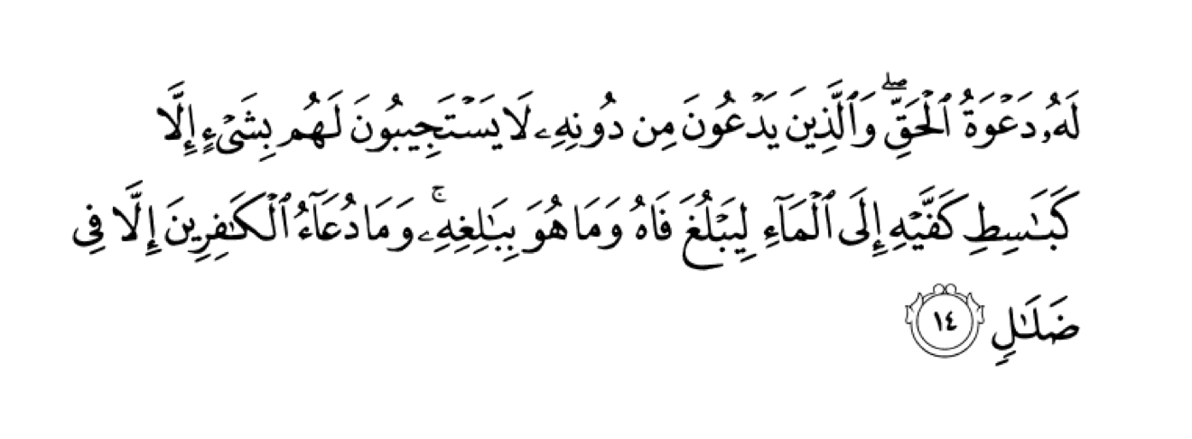 Unto Him is the Call to Haqq. And those they call upon besides Him do not respond to them with a thing, except as one who stretches his hands toward water [from afar, calling it] to reach his mouth, but it will not reach it [thus]. And the supplication of the disbelievers is not but in error [i.e. futility].